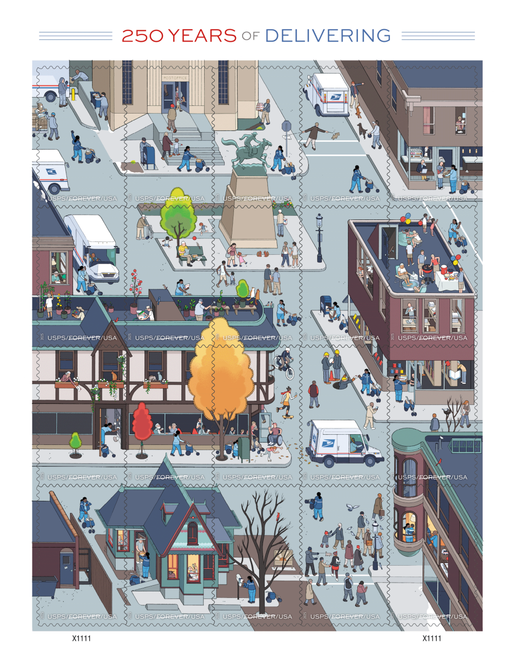 The meticulous artwork shows a bird’s-eye view of a bustling town. Each individual stamp is a frame of sequential art, telling the story of a mail carrier’s journey as she walks her daily route. Laid out in four rows of five stamps, the story progresses through a year’s four seasons, from top-left to bottom-right.