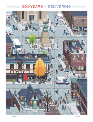 Issued to celebrate a major U.S. Postal Service anniversary, 250 Years of Delivering is an illustrated pane of 20 interconnected stamps representing the ubiquitous presence of USPS throughout the years — and the vital role the postal system has played in connecting Americans since 1775.