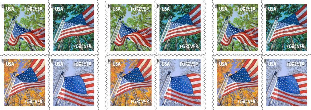 The A Flag for All Seasons stamps are being issued as a Forever® stamp. This Forever stamp will always be equal in value to the current First-Class Mail® one-ounce price.