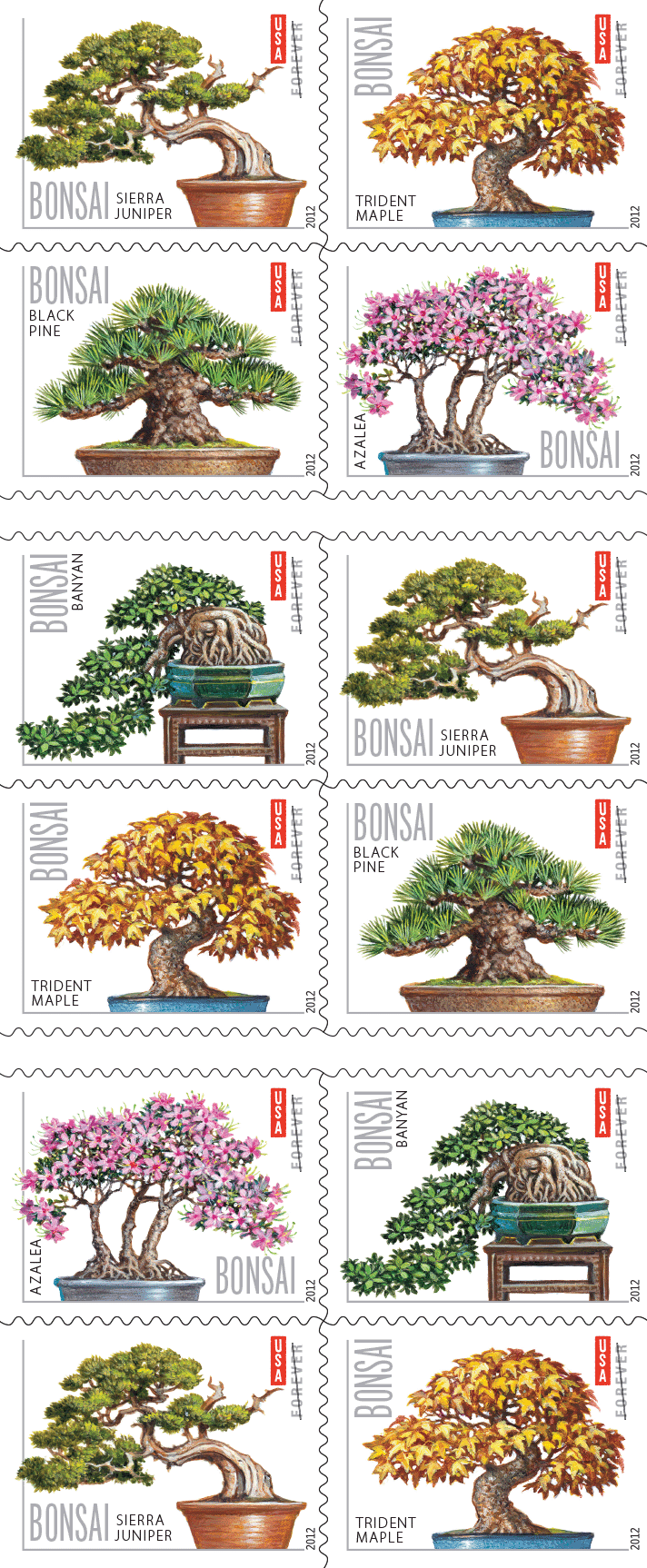 The Bonsai stamps are being issued as Forever® stamps in self-adhesive booklets of 20 (4 of each design). Forever stamps are always equal in value to the current First-Class Mail one-ounce rate.