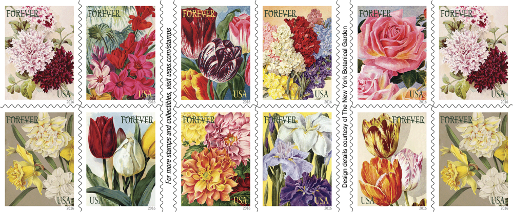The U.S. Postal Service® continued its tradition of beautiful floral-themed stamps with Botanical Art. The stamp art features ten designs, each a detail of an illustration from an American nursery catalog printed between 1891 and 1912. The design details are courtesy of The New York Botanical Garden; the catalogs are part of NYBG’s Nursery and Seed Catalog Collection, one of the largest and most important such collections in the U.S.
