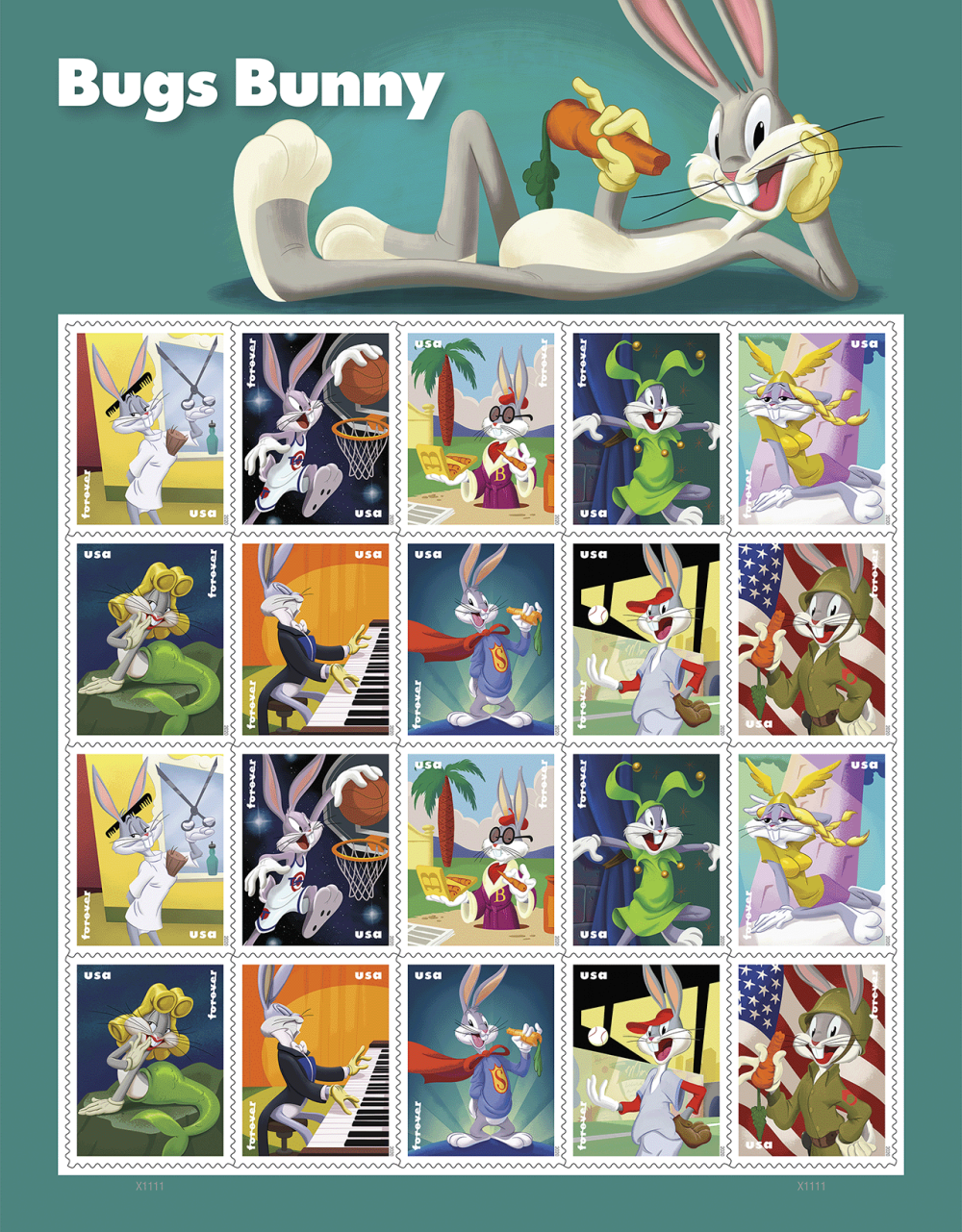 This issuance celebrates Bugs Bunny and the marvelous masquerades he has employed to foil foes over the course of his 80-year career. The sheet of 20 stamps features Bugs in 10 classic costumes.