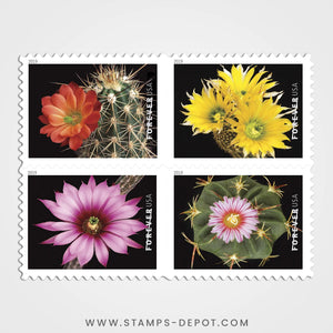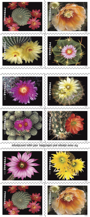 The Cactus Flowers stamps were issued as Forever® stamps in booklets of 20. These Forever stamps will always be equal in value to the current First-Class Mail® one-ounce price.
