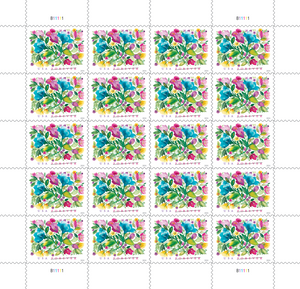 The stamp design features brilliantly colored abstract flowers rendered in ink and gouache paint. Gouache is known for its lustrous color, which the artist used to create the vivid hues of red, yellow, purple, pink, green, and blue that grace this horizontal floral illustration.