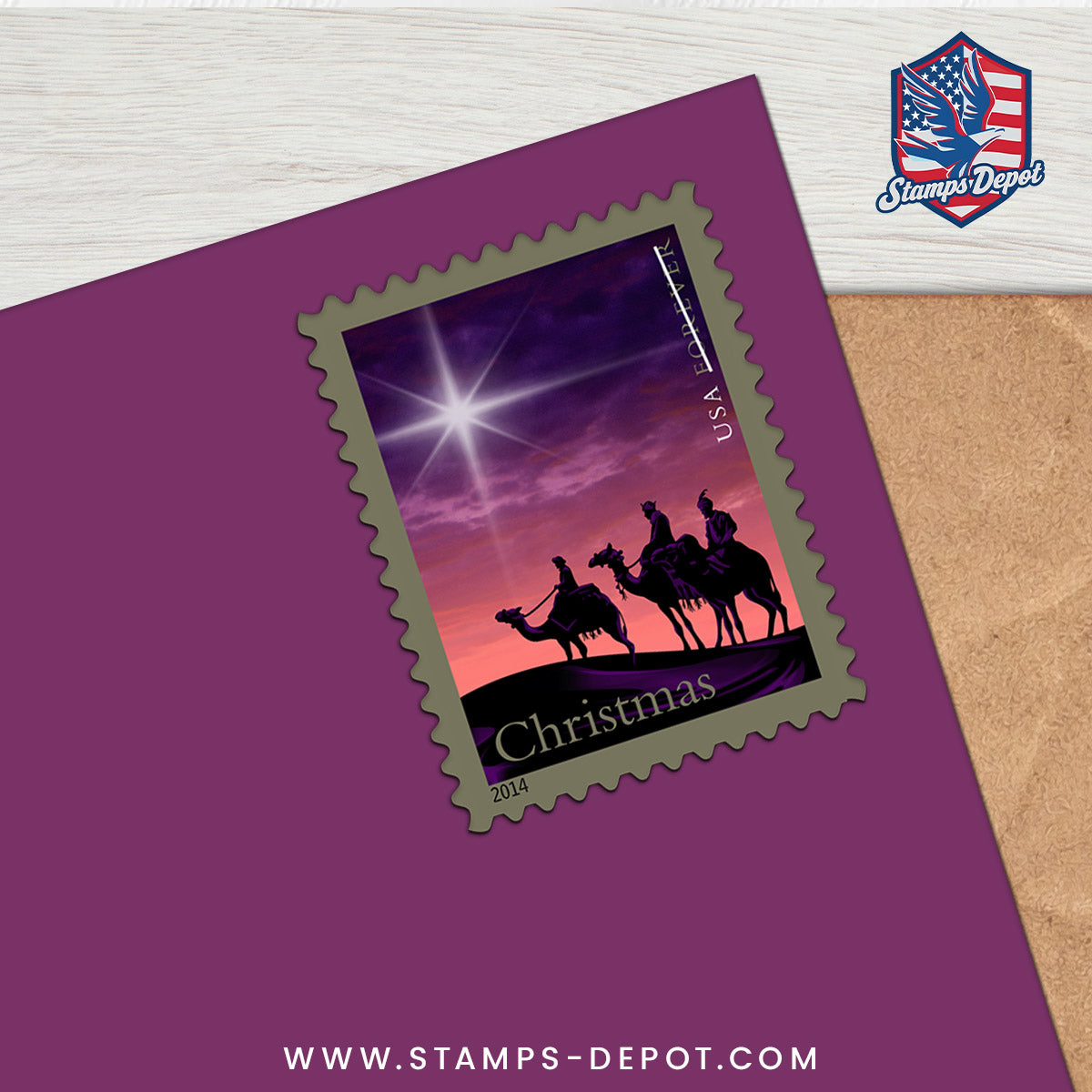 The stamp art illustrates the traditional tale of the Magi, who came bearing gifts for Jesus. The three regal figures sit atop a trio of bedecked and harnessed camels, the animals almost at the summit of a small hill. Guiding them is a large, dazzling star shining in the sky. The colors in the sky range from a rose near the horizon, darkening to a rich purple at the top, suggesting that the travelers are moving through the desert at dawn. The figures are silhouetted against the background, with the details of their headdresses and the camels' saddles just visible in the brightening light. The star, located in the upper left-hand corner of the picture, is a brilliant white.