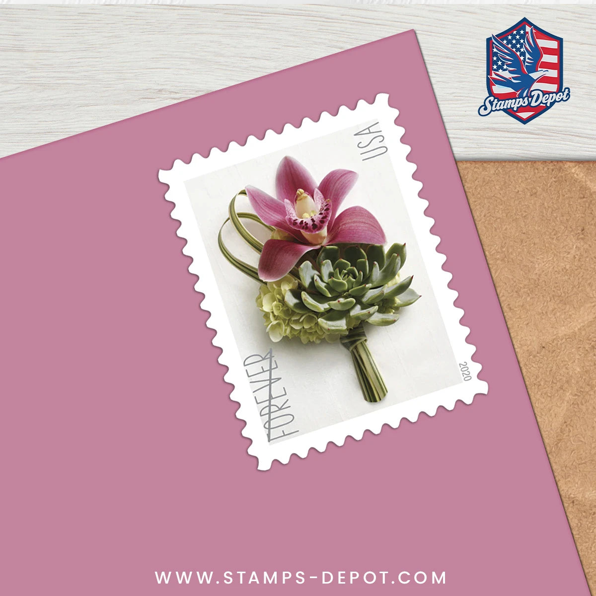 Contemporary Boutonniere is a Forever® stamp issued by the U.S. Postal Service. Similar in design to the two-ounce Garden Corsage stamp, it can be used on RSVP envelopes often enclosed with wedding invitations. It is also perfect for party invitations, thank-you notes, and announcements, in addition to regular correspondence.