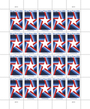 The Drug Free USA stamp art features a white star with lines of red, light blue and blue radiating from one side of each of the star’s five points, suggesting the unity necessary at all levels to effectively address drug abuse.