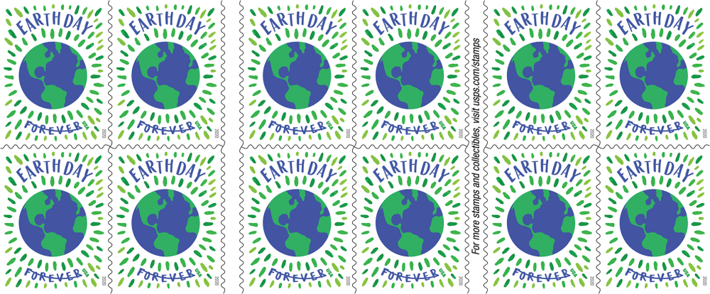 Earth Day is being issued as a First-Class Mail® Forever® booklet of 20 stamps. This Forever stamp will always be equal in value to the current First-Class Mail one-ounce price.