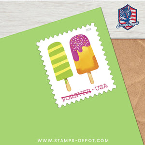 Frozen Treats was issued as a First-Class Mail® Forever® booklet of 20. These Forever stamps will always be equal in value to the current First-Class Mail one-ounce price.