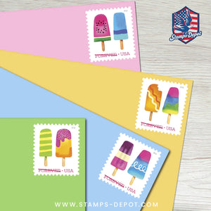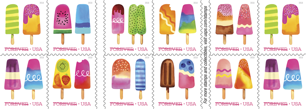 Cool off with Frozen Treats, a U.S. Postal Service® stamp issuance featuring frosty, colorful, icy pops on a stick. The tasty, sweet confections come in a variety of shapes and flavors.