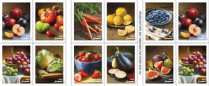 Fruits & Vegetables are being issued as Forever® stamps in booklets of 20. These Forever stamps will always be equal in value to the current First-Class Mail one-ounce price.