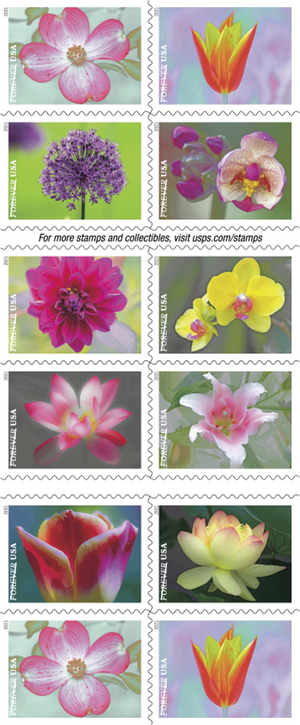 Allen Rokach took the photos that grace the stamps. With these close-up shots, the flowers are the stars, taking up almost the entire frame of each photo. Each stamp features one of the following flowers: a pink flowering dogwood; a rose-pink and white tulip; an Allium or ornamental onion; a pink and white Asiatic lily; a magenta dahlia; a yellow and pink American lotus; a pink moth orchid with mottled petals; a pink and white sacred lotus; an orange and yellow tulip; and a yellow moth orchid with a pink center.