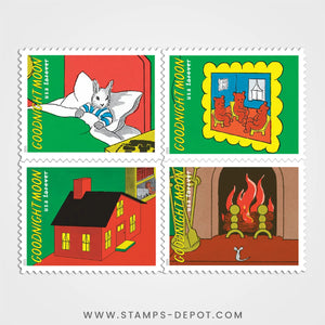 This pane of 16 stamps features eight details from the beloved picture book, including: the young bunny tucked into bed; the painting of three little bears; the toy house on the bedroom floor; the mittens and socks hung to dry; the tiny mouse paused for just a moment in front of the fireplace; the painting of the cow jumping over the Moon; the older bunny sitting in the rocking chair with her knitting; and the comb, brush, and bowl of mush atop the young bunny's bedside table. Each scene appears twice on the pane.