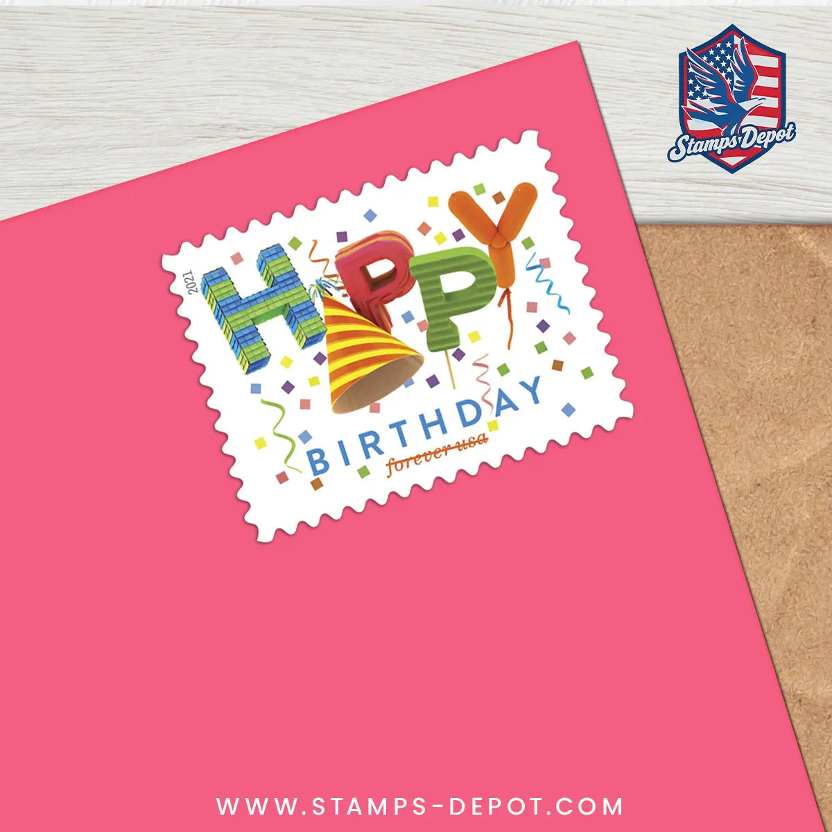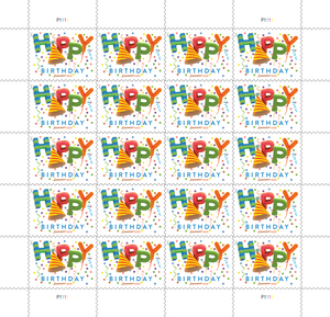 The Happy Birthday stamp was issued as a Forever® stamp. This Forever stamp is always equal in value to the current First-Class Mail® one-ounce price.