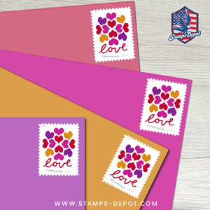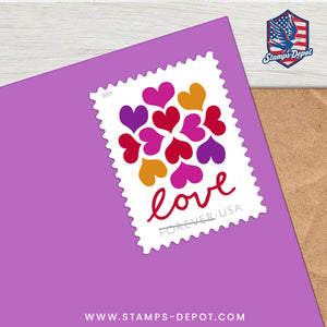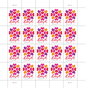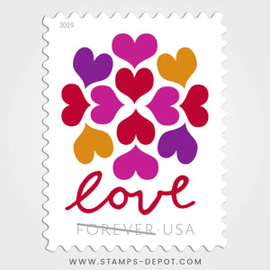 On the stamp, 12 colorful hearts visually express love’s joyful, bountiful nature. The color palette — red, purple, orange, and pink — is intended to create a happy and positive feeling.