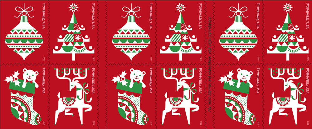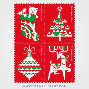Celebrate the holidays with four stamps from the U.S. Postal Service. Inspired by folk art but with a modern graphic vibe, these charming stamps will add a touch of whimsy to your holiday mailings.