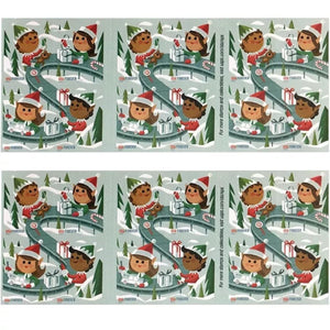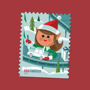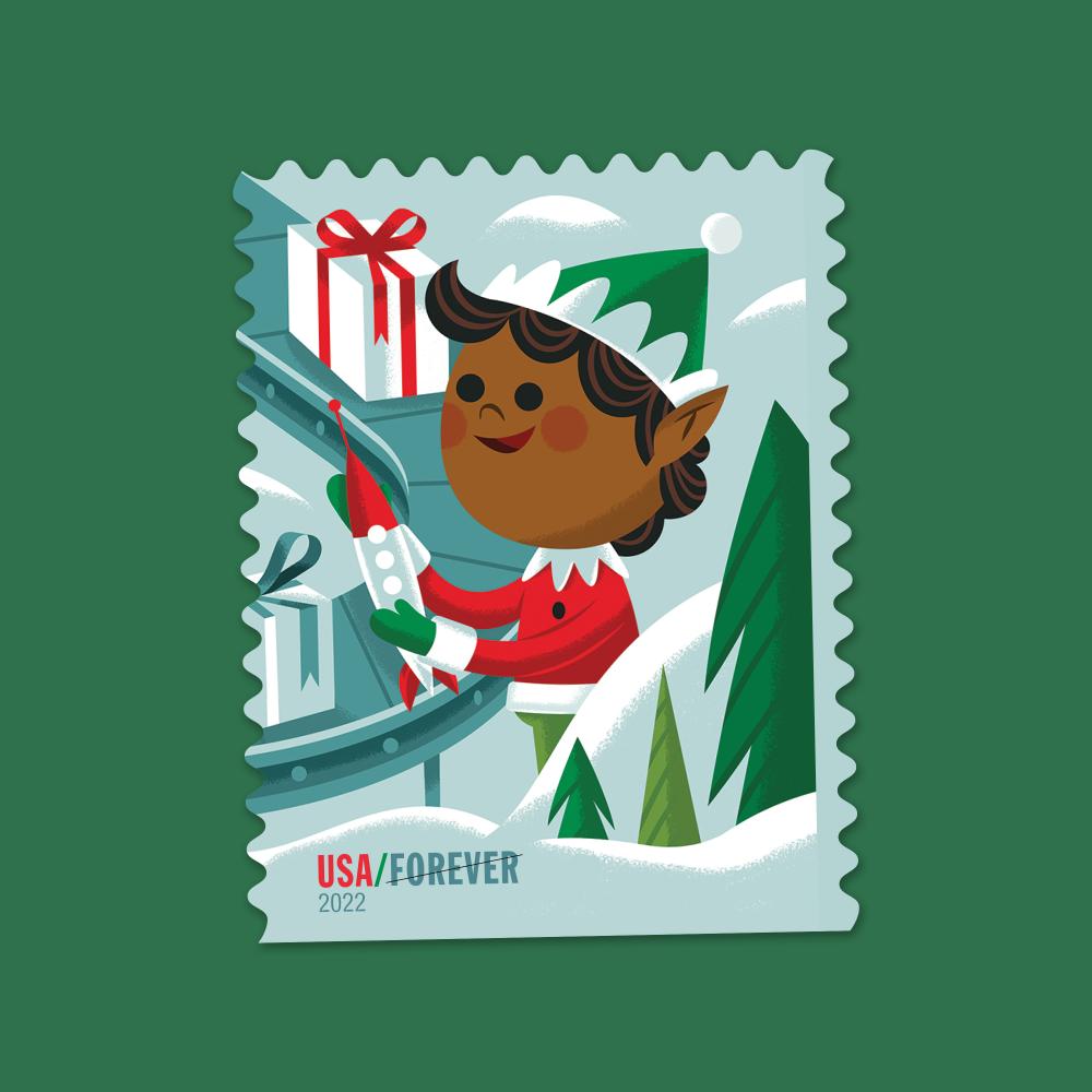 Whimsical elves bring smiles to the holidays with four se-tenant stamps from the U.S. Postal Service®. Elves are depicted joyfully at work: One sews a teddy bear, another wraps a gift, while two more work on a model car and inspect a model rocket. A conveyor belt laden with wrapped presents and candy snakes through a snowy landscape framed by a forest of evergreens.