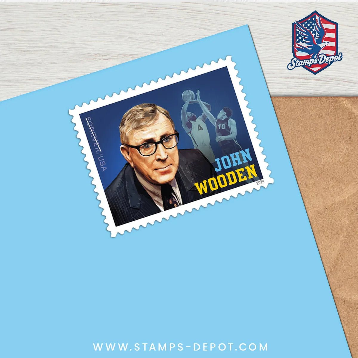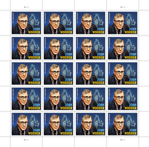 This stamp honors John Wooden (1910–2010), the legendary coach who led the University of California, Los Angeles (UCLA) Bruins to a record-setting 10 Division I men’s basketball national championships.