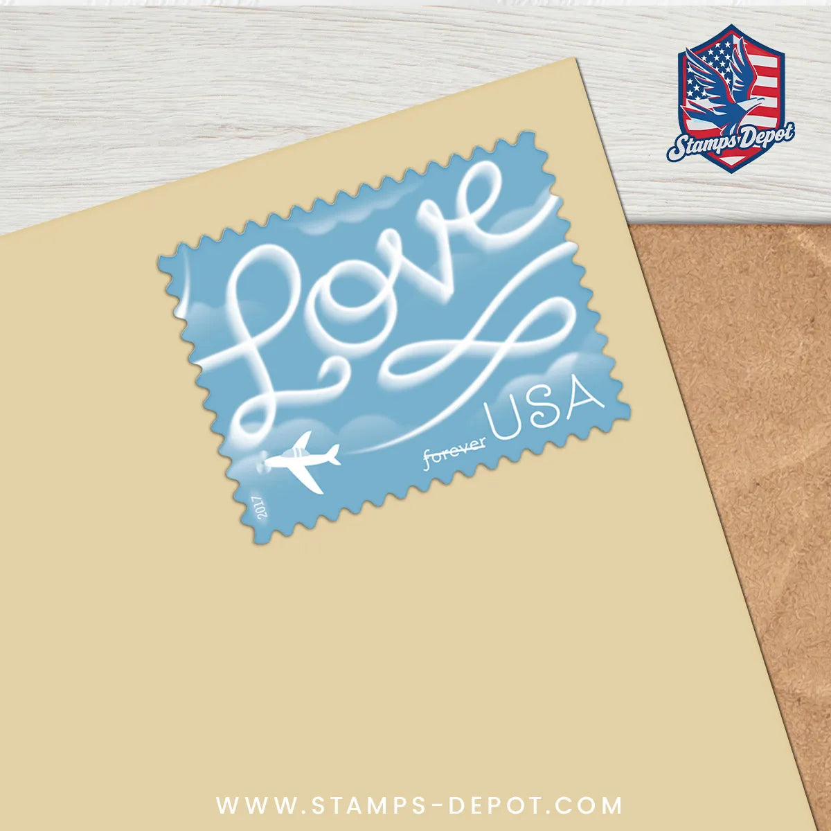 The Love Skywriting stamp was issued as a Forever® stamp. This Forever stamp will always be equal to the current First-Class Mail® one-ounce price.