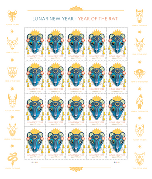 The Year of the Rat stamp is being issued as a Forever® stamp in panes of 20. This Forever stamp will always be equal in value to the current First-Class Mail® one-ounce price.