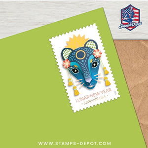 Utilizing blue as the predominant color — said to be one of the lucky colors for individuals born during the Year of the Rat—the rat mask in the stamp design incorporates elements with symbolic meaning. Several of the patterns were created with the style of Asian textiles in mind and the circle in the center of the rat’s head represents the new moon on which the Lunar New Year begins. A pop of the very lucky color red ties the design in with other common celebratory decorations.