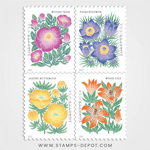 Celebrate the beauty of mountain wildflowers with four stamps. Each stamp in the block of four includes an illustration of one of these flowers: a purple pasqueflower; an orange-red wood lily; a bright yellow alpine buttercup; and a dark pink Woods’ rose. The artist’s hand-drawn illustrations, refined digitally, create a block-print aesthetic. The color and shape of each flower was selected for its unique beauty and to complement the block of four.