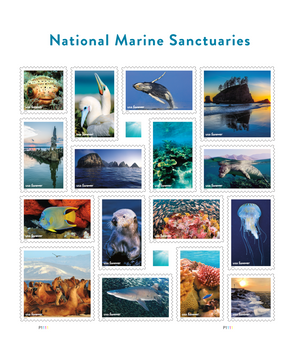 The 16 stamps on the National Marine Sanctuaries pane showcase the abundant wildlife and diverse ecosystems that can be found throughout the National Marine Sanctuary System.