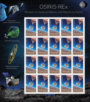 This 20-stamp pane from the U.S. Postal Service celebrates NASA’s seven-year OSIRIS-REx mission to study and map the asteroid Bennu and return a sample of the surface to Earth in September 2023. This is the first pristine sample of an asteroid collected by the United States, and it will help scientists learn how our solar system formed.