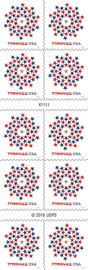 To accommodate business use, the Postal Service™ issued Patriotic Spiral, a Forever® stamp sold in self-adhesive booklets of 10. These Forever stamps will always be equal in value to the current First-Class Mail® one-ounce price.