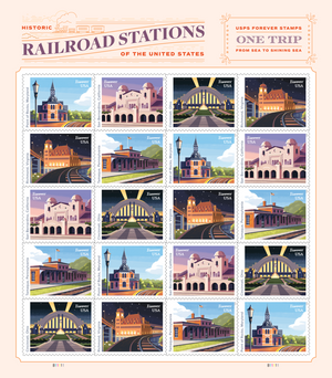 The Railroad Stations stamps are being issued as Forever® stamps. These Forever stamps will always be equal in value to the current First-Class Mail® one-ounce rate.
