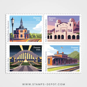 More than simply places to buy tickets and wait for a train, railroad stations exude history, romance, and the optimism associated with forward motion. Noteworthy railroad stations began brightening the American landscape by the 1870s and, although many fell to the wrecking ball once they had outlived their original purpose, hundreds survived. This issuance features five architectural gems that continue to play an important role in their community.