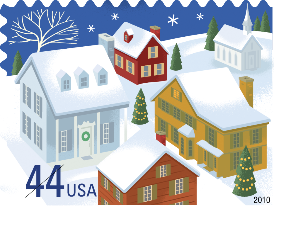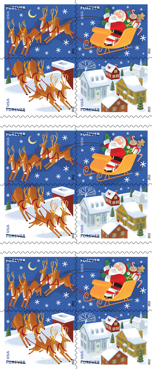 Santa’s annual journey is joyfully captured in this block of four holiday stamps, with two rows of two stamps each presenting a “classic” image of Santa and his reindeer circling around snow-covered rooftops.