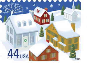 These cheerful stamps portray Santa Claus flying through the air in his sleigh. With a cargo of toys and gifts produced in his workshop by elves, he lands on the rooftop of house after house and slides down the chimney to leave presents for girls and boys of all ages.