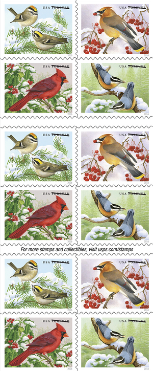 The Songbirds in Snow stamps were issued as Forever® stamps. These Forever stamps will always be equal to the current First-Class Mail® one-ounce price.