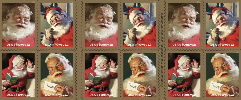 Each of the four images portraying a close-up of Santa’s face are details from larger paintings created by Sundblom and originally published in ads for The Coca-Cola Company from the 1940s through the early 1960s. The stamp is available in booklets of 20.