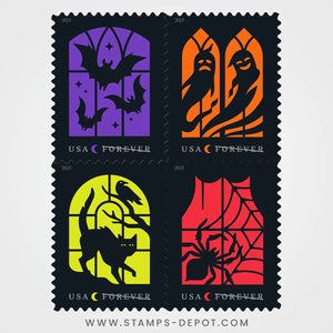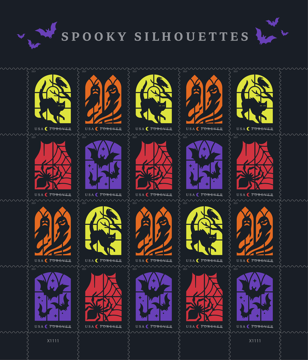 These four stamps feature digital illustrations in which traditional Halloween motifs are rendered as black silhouettes in eerily backlit windows: a spider and a spider web against a red background; three bats against a purple background; a cat with an arched back beneath a raven perched on a bare tree branch, all against a yellowish-green background; and two ghosts against an orange background.