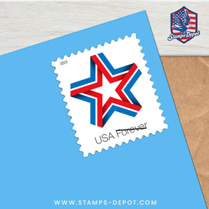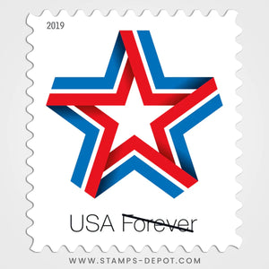 In 2019, the Postal Service™ issued Star Ribbon, a Patriotic Forever® stamp sold in sheets of 20. Offering a fresh take on patriotic stamps, the design features a digital illustration of a star made from a single red, white, and blue ribbon. The white space in the middle of the ribbon creates a second smaller star. The words “Forever” and “USA” appear below the star. The tri-colored ribbon, folded into a patriotic symbol, is intended to evoke the connectedness of the American people.