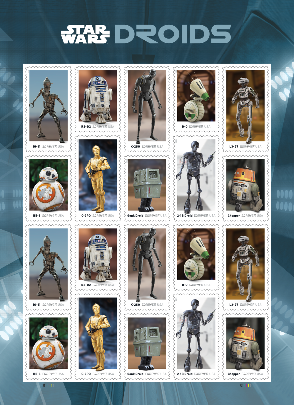 The marvelous, mechanical Star Wars™ droids have entertained and amazed for more than four decades. In 2021, the U.S. Postal Service — inspired by a galaxy far, far away — celebrated these wondrous creations with a pane of 20 stamps featuring 10 favorite droids.
