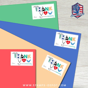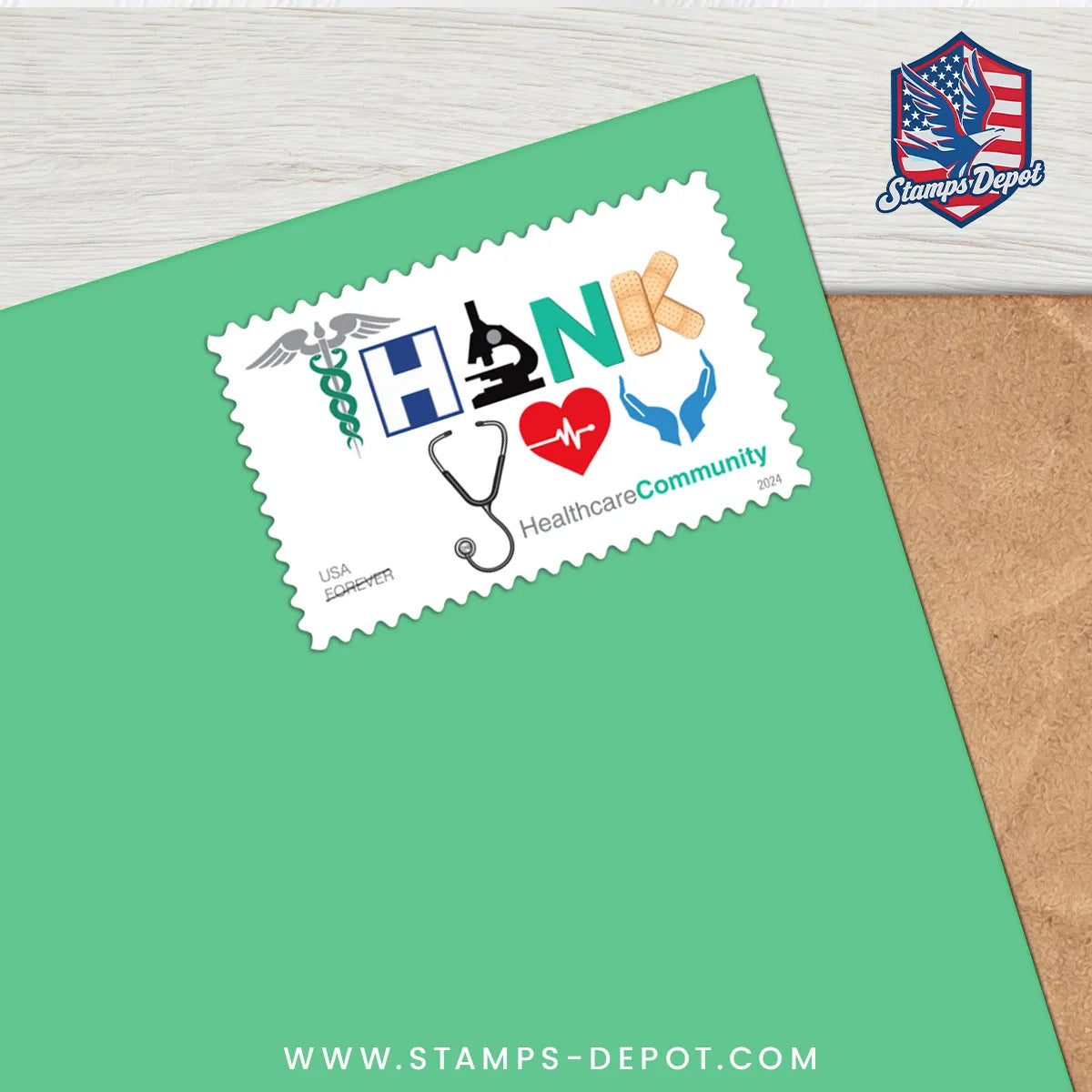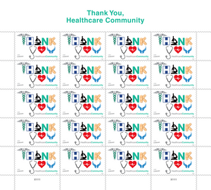 The Thank You, Healthcare Community stamp is being issued as a Forever® stamp in a pane of 20. This Forever stamp is always equal in value to the current First-Class Mail® one-ounce price.