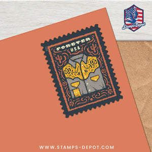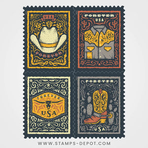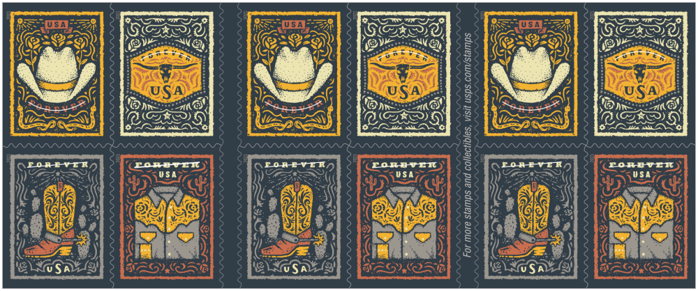 The U.S. Postal Service celebrates the enduring legacy of Western wear with four fun Forever® stamps. Inspired by the clothing and gear used by working ranchers and reimagined in fun and fanciful ways, the garments and accessories of the West comprise a unique American fashion style.