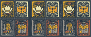 This booklet of 20 stamps features four designs illustrating iconic Western wear staples — a cowboy hat, a cowboy boot with a spur, a Western shirt, and a belt buckle featuring a longhorn head. A stippling technique, creating images using small dots of color, was used to give the illustrations a worn and gritty feel. Each image is framed by elements common to the American West and iconography of the region, including cacti, snakes, roses, and stars.